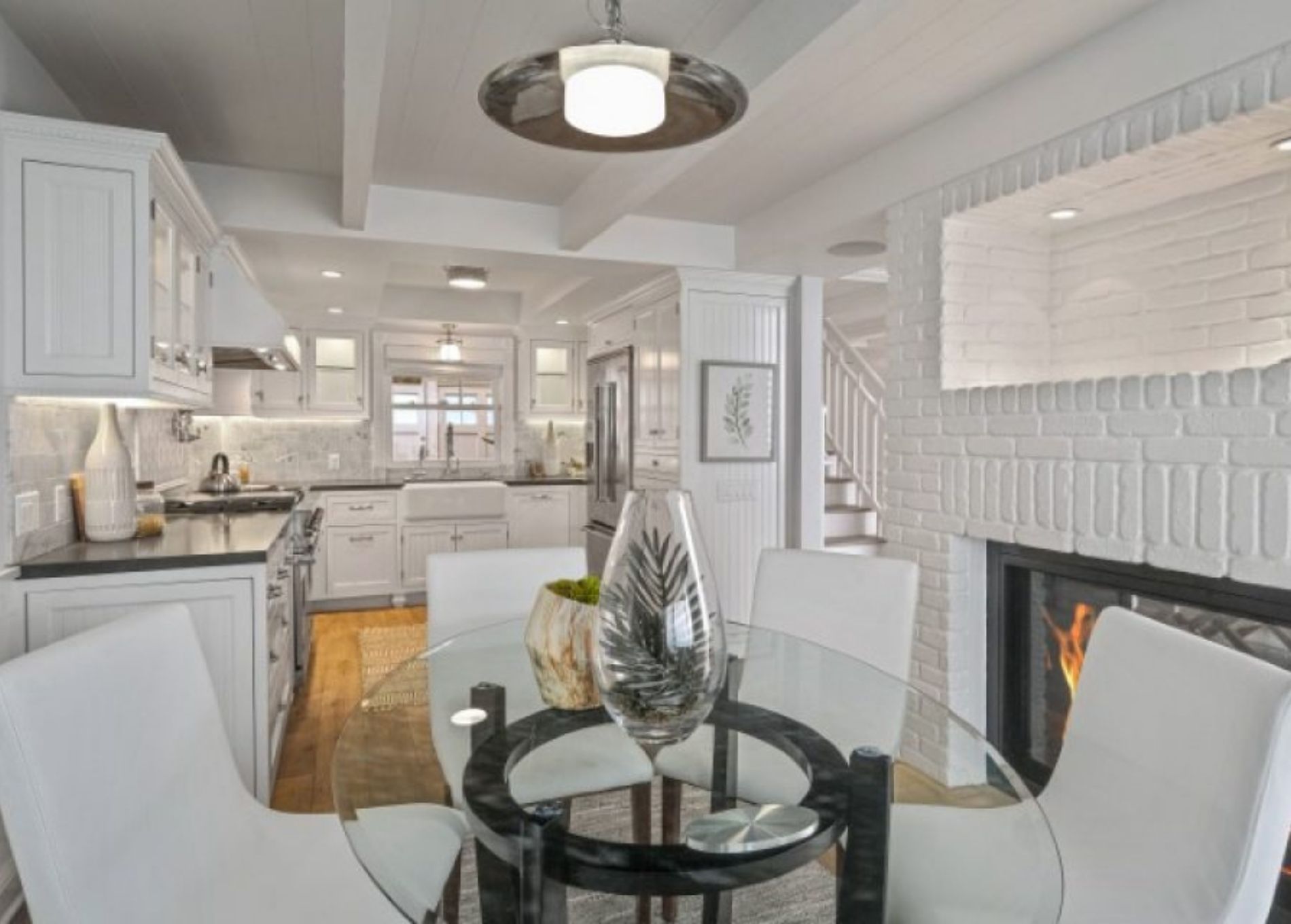 Another side of this room here we can see the kitchen, which opens to the dining room. The white brick on the room's fireplace side works beautifully with the white cabinets in the kitchen. The elegant white ceilings with the beautiful textures up there, too, add to the overall classy feel of this room. We imagine it's a cozy place to host a dinner with friends.