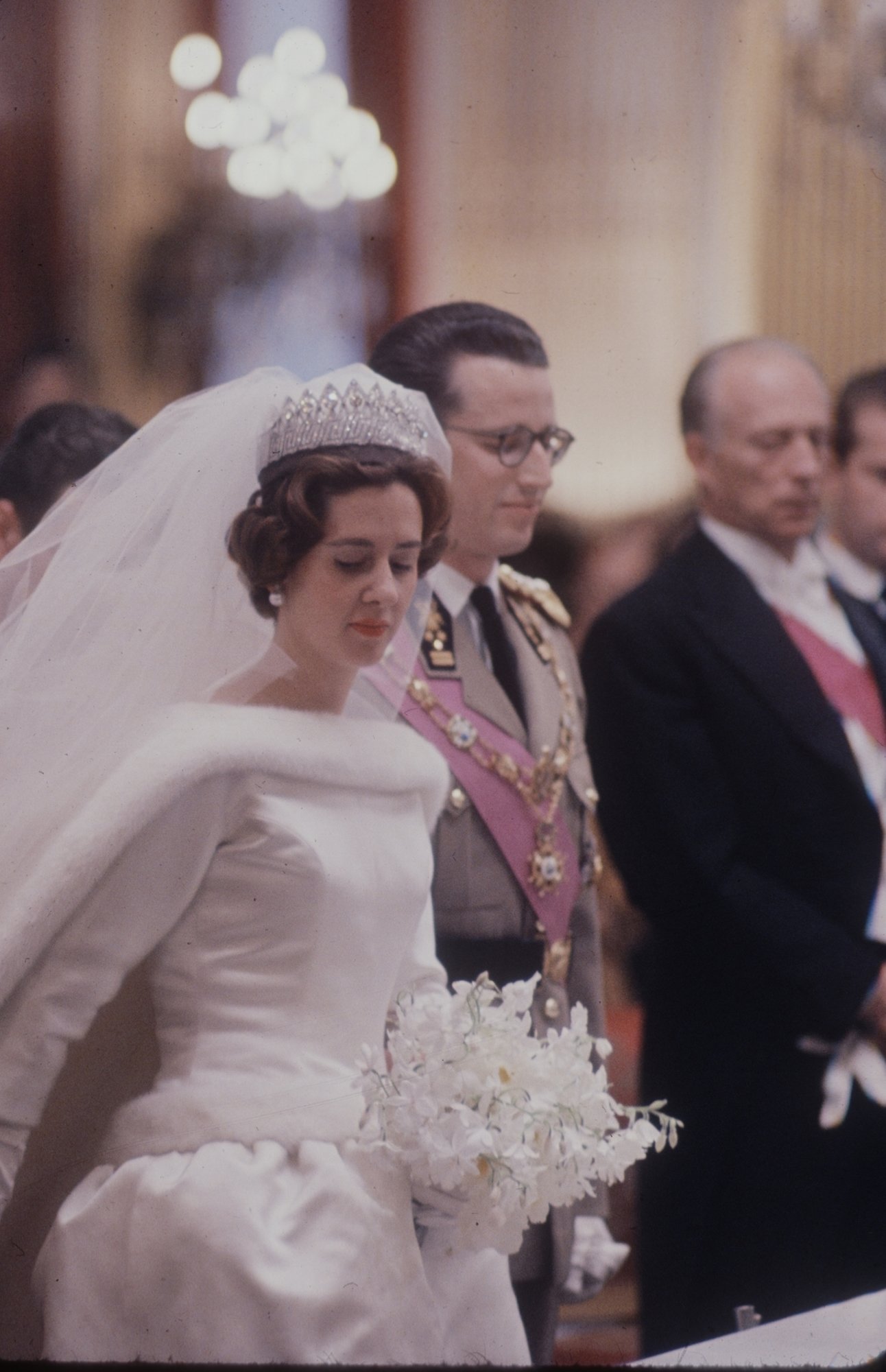 A Spanish nurse who married a Belgian king, Fabiola knew she had to come up with a dress fit for a queen — and she did just that when she chose haute couture legend and fellow Spaniard Cristobal Balenciaga. He created a one-of-a-kind look that was simple and extremely opulent: a silk gown whose drop-down waist and neckline-turned-cape is lined with ermine, a fur associated with royalty.