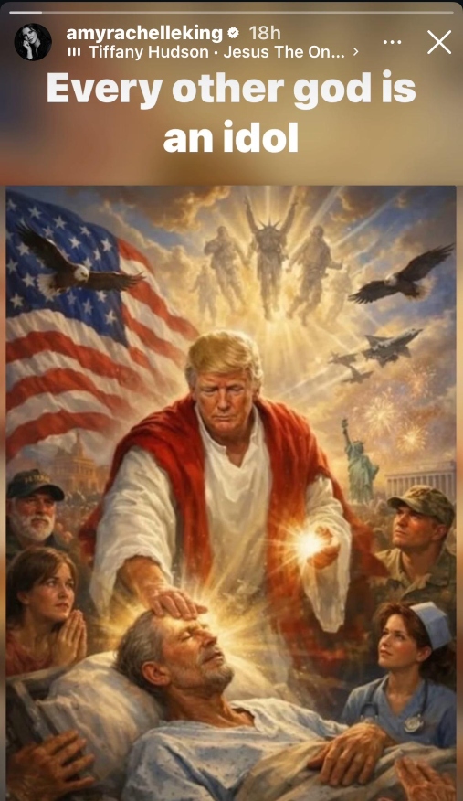 Amy shared Trump’s AI photo in her Instagram Stories and wrote along with it, “Every other god is an idol.” The picture, in case anyone needs a refresher, depicts Trump as Jesus as he stands over the hospital bed of a sick man. His hand is stretched out over the man and what can only be described as a healing light is coming from Trump’s hand to presumably heal the man.
