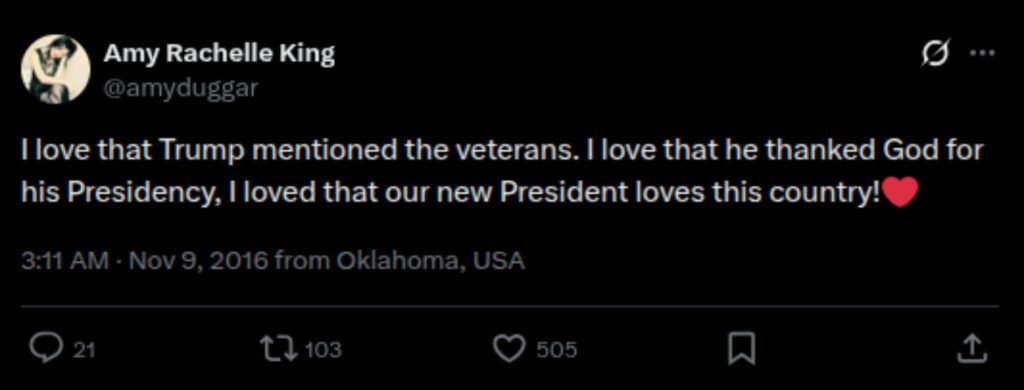 To be fair, some of the confusion came with Amy’s seemingly former stance on Trump. When he was elected into office in 2016, Amy posted about it on X (formerly Twitter). At the time, she wrote, “I love that Trump mentioned the veterans. I love that he thanked God for his Presidency, I loved that our new President loves this country!”