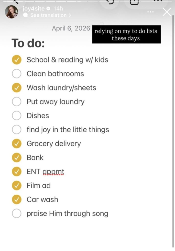 In the to-do list that was shared on Reddit, Joy-Anna listed homeschooling with her kids, washing sheets and doing laundry, getting her groceries delivered, going to the bank, making an ENT appointment, filming an ad, and getting a car wash as all checked off tasks. Do we even need to go into “filming an ad”? It does pass for a Duggar job these days, with the amount of grifting the adult kids tend to do.