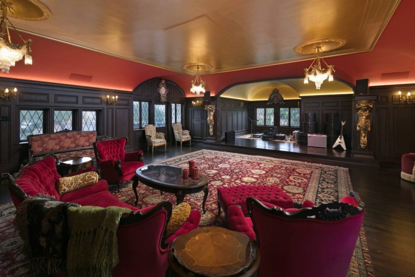 This big, open space is perfect for entertaining, and judging by all that seating, it seems like that might be exactly what Kat used it for. The red theme clearly continues inside the house, with velvet couches and armchairs accented by gold sconces and multiple chandeliers scattered on the ceiling.