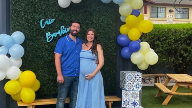Using show host Arielle Vandenberg for scale, it looks like the villa's pool is quite large. It's sunken down from the main patio area, and surrounded by giant pots filled with flowering plants. There's even faux grass surrounding the pool, giving the entire area more of an island vibe.