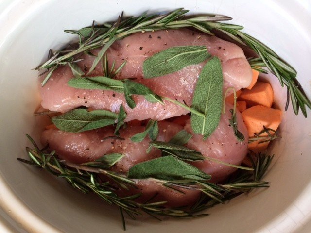 Start by spreading the sweet potatoes at the bottom of the slow cooker. Sprinkle with salt and pepper. Place a few herbs on top.