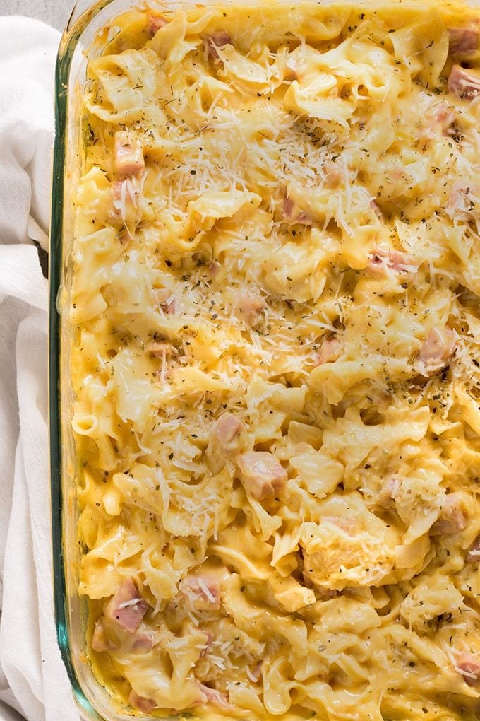 Make a ham for Sunday dinner, and use the leftovers in this cheesy ham and noodle casserole that's ready to eat in less than 45 minutes. Canned cheddar cheese soup or cream of chicken soup work equally well for this recipe, and it can be topped with any well-melting shredded cheese that's hanging out in the fridge