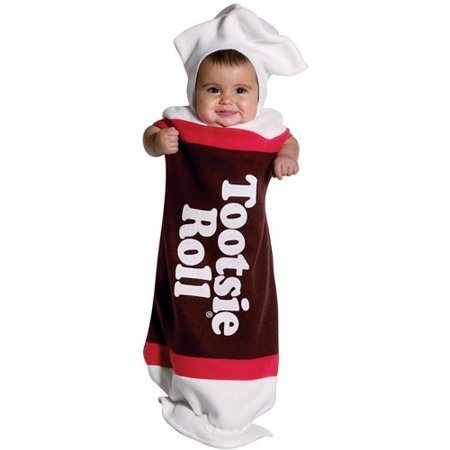 We love nibbling on a baby's ears … and toes … and tiny little fingers … basically, babies are made for nibbling, which is why they're perfect as a sweet treat — and since a little bunting bag is a happier costume for many babies than one with legs, a Tootsie Roll is an ideal candy for costuming inspiration.