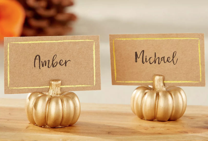 Make guests feel welcome and special by putting place card holders at their seats at the dinner table. These holders are gold pumpkins with the stem holding the card itself.