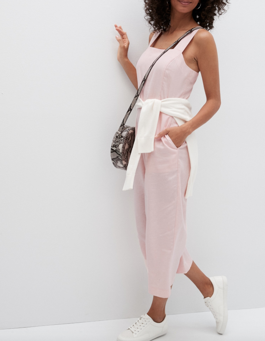 Baby pink never looked so good, especially on a romper/jumpsuit. This one has a square neck and pants which makes it the ideal summer outfit. It can be worn during the day and transition to a night outfit when the weather cools down a bit.