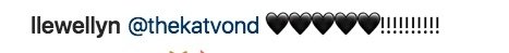 Kat responded to a fan who commented "He loves you" with a series of black hearts.