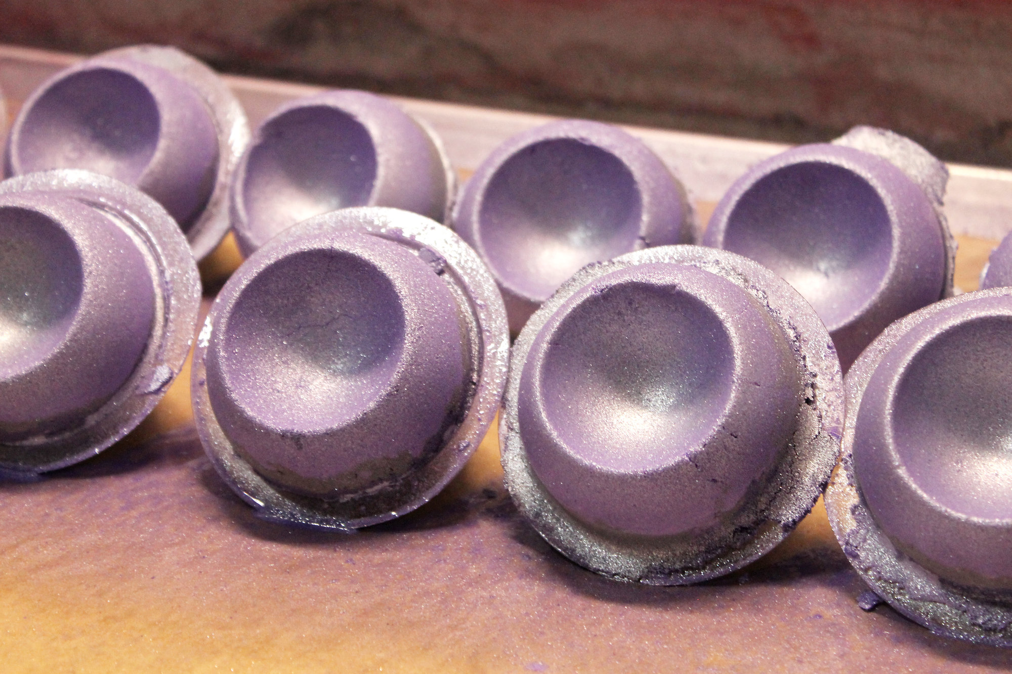 Each bomb has its own specific order in which compounders must load their colored mixes into a mold. For Goddess, the compounders coaching me laid out the top and bottom molds for three or four bombs at once, then had me load each with a small amount of green, then large amounts of purple, medium amounts of silver and lilac, and another large helping of green.