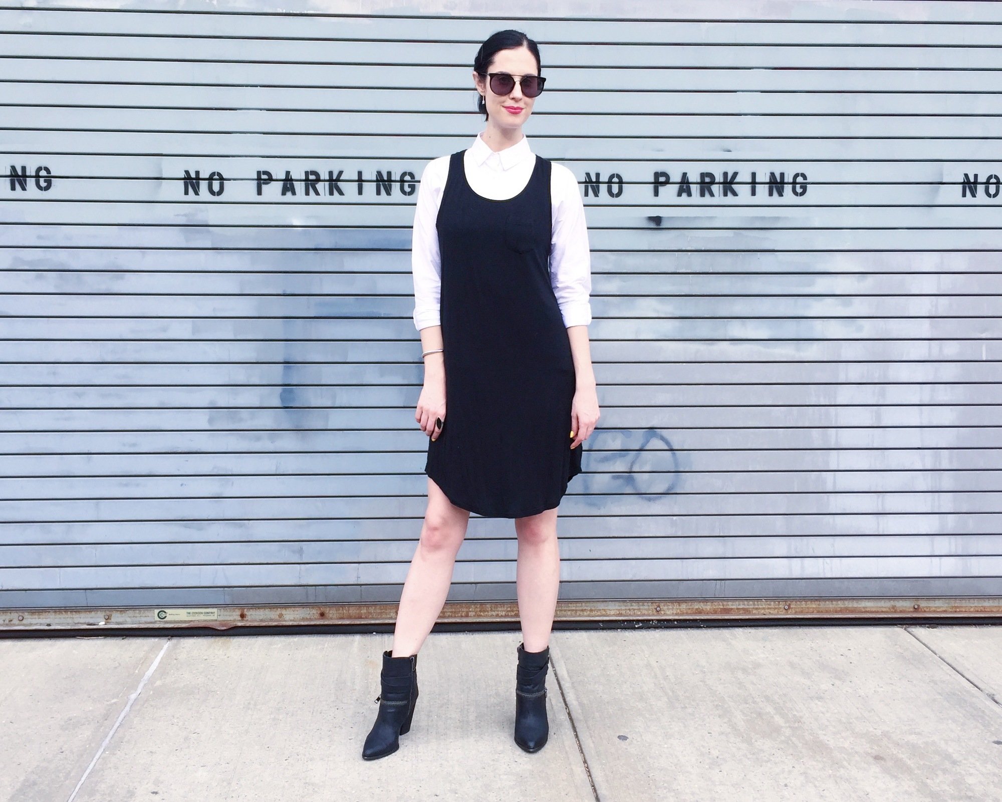 White shirts aren't just awesome on their own; they also make amazing layering pieces. I'm wearing it under a slouchy black dress and awesome boots, because I like the way the severity of the shirt contrasts with the looseness of the dress.