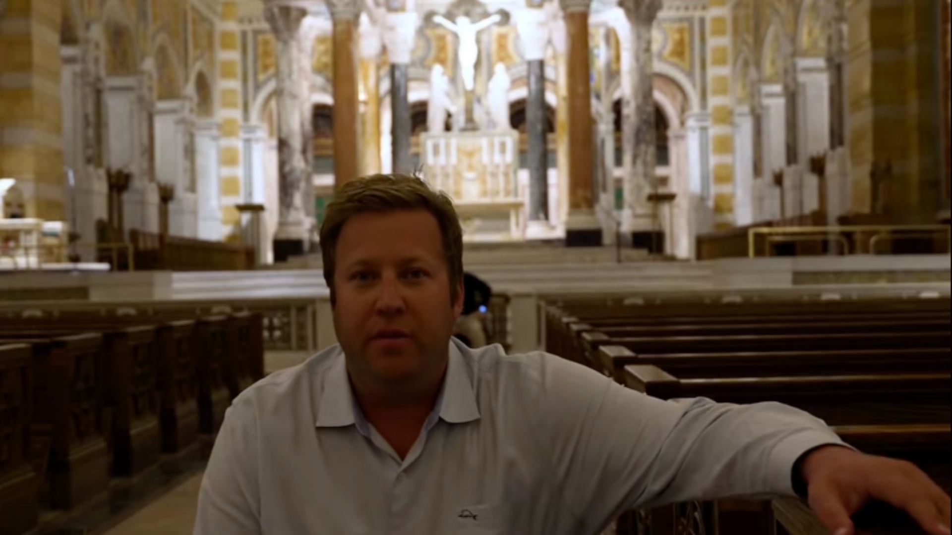 Someone tries to usher the man out of the way, but he won’t leave. We can also hear someone shouting that the church is closed, even as Hessler and Reynolds’ special moment unfolds right behind him.