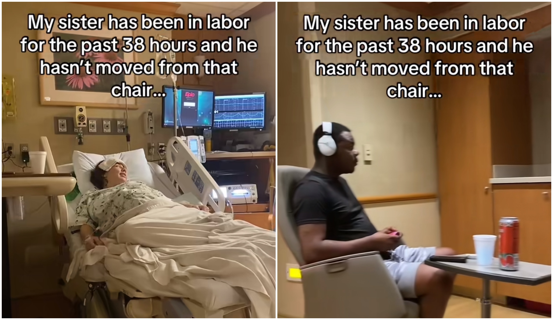 In the TikTok, the sister of the mom-to-be points her phone at the mom going through hours of birth in a hospital bed. Then, she pans over to the new dad, who is playing a video game in the room, far from his partner’s side, where he should probably be. The text on the screen says, “My sister has been in labor for more than 38 hours and he hasn’t moved from that chair…”