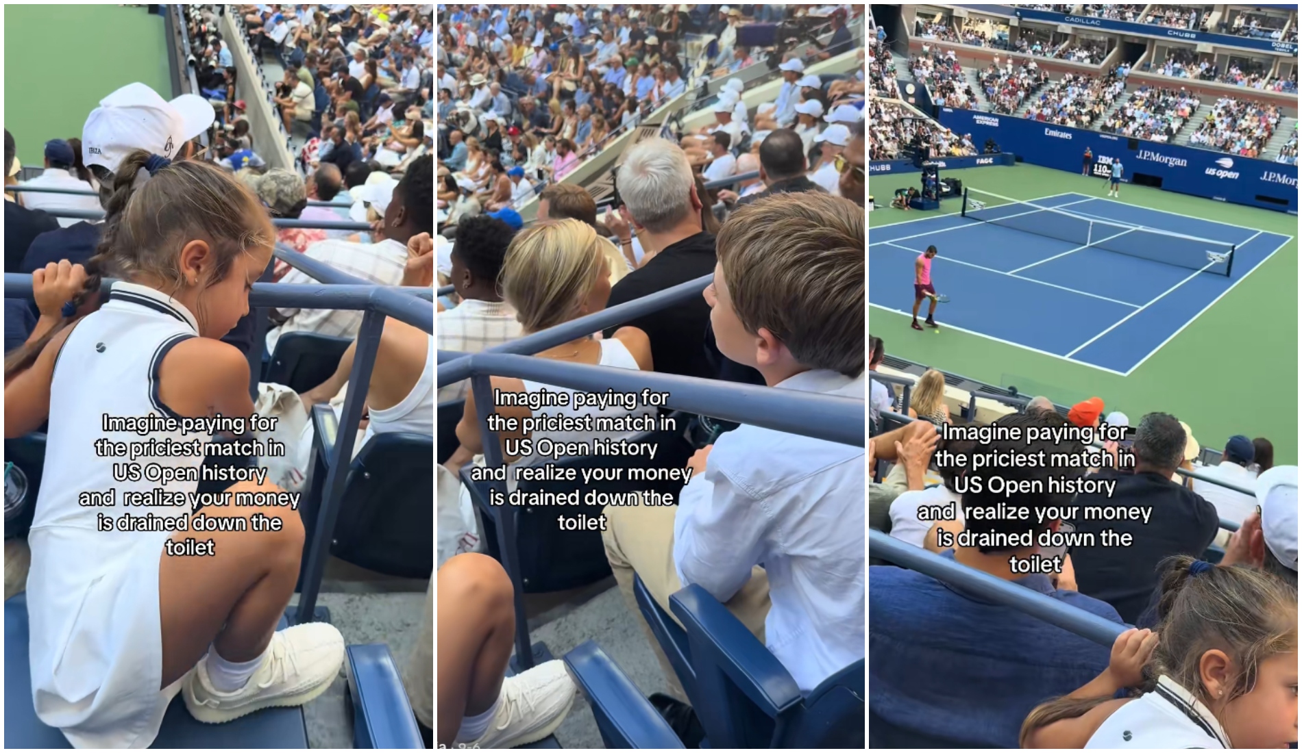 The mom on TikTok shared a video of her kids in their seats at the US Open and wrote on the screen, “Imagine paying for the priciest match in US Open history and realize your money is drained down the toilet.” Her children seem bored and tired as they sit in their seats.