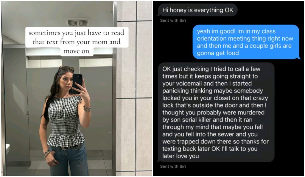 In the TikTok, the mom’s text when checking up on her daughter says, “OK just checking, tried to call a few times but it keeps going straight to your voicemail and then I started panicking thinking maybe somebody locked you in your closet on that crazy lock that’s outside the door, and then thought you probably were murdered by some serial killer, and then it ran through my mind that maybe you fell and you fell into the sewer and you were trapped down there, so thanks for texting back later. OK talk to you later, love you.”