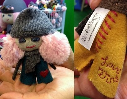 Rita Ross started out making little dolls from fabric scraps while she was recovering from cancer. Now she's taken those originals as prototypes for Pocket People dolls. They do fit in your pocket, but Rita's idea is that there are all kind of different "pockets" of people, but "everyone matters." I was just taken by their personalities. There's something really sweet about them.