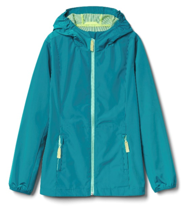 The roomy, comfortable Rain Day Jacket resists both rain and wind, but it still breathes so she won’t get all hot and sweaty just trying to stay dry. Zip pockets keep essentials from getting lost, and the hood has elastic and a brim to stay up but stay out of her line of vision.