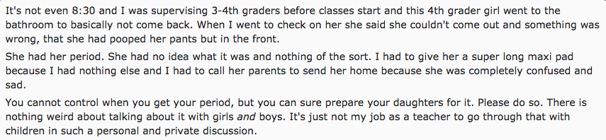 According to the teacher, the little girl had no idea what was happening with her. She had no knowledge of periods or puberty at all. "I had to give her a super long maxi pad because I had nothing else and I had to call her parents to send her home because she was completely confused and sad," she wrote.
