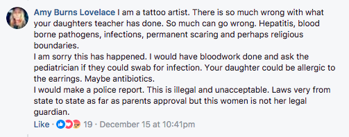 The teacher allegedly saw her "dents" from her healed piercings and found nothing wrong with trying to pierce them again.