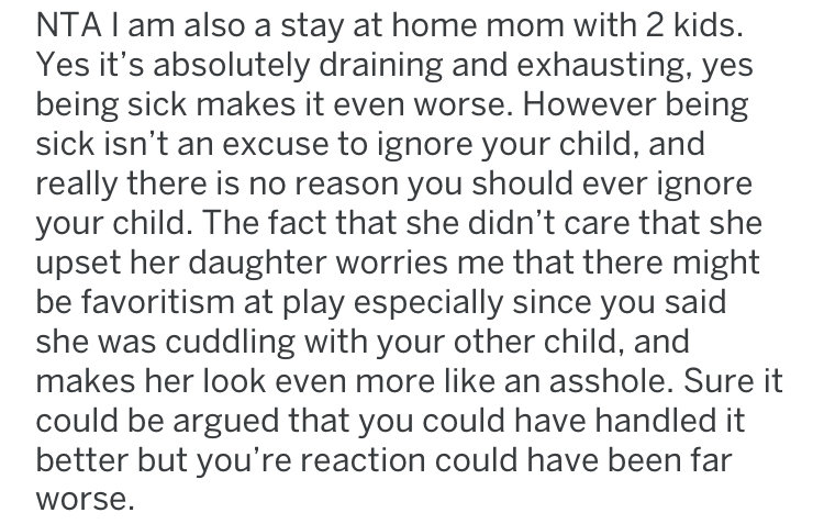 They felt that being sick was not an excuse to let your child feel unloved and worried that the wife had made her daughter feel like their older child.