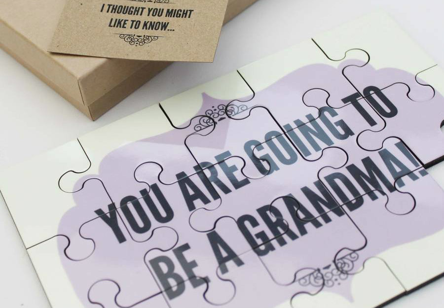 This may be the only puzzle to make people cry from happiness at solving it than frustration. Have the grandma or grandparents to be put the pieces together until the big message is revealed. Can glue it to a cardboard box piece and frame it as a keepsake.