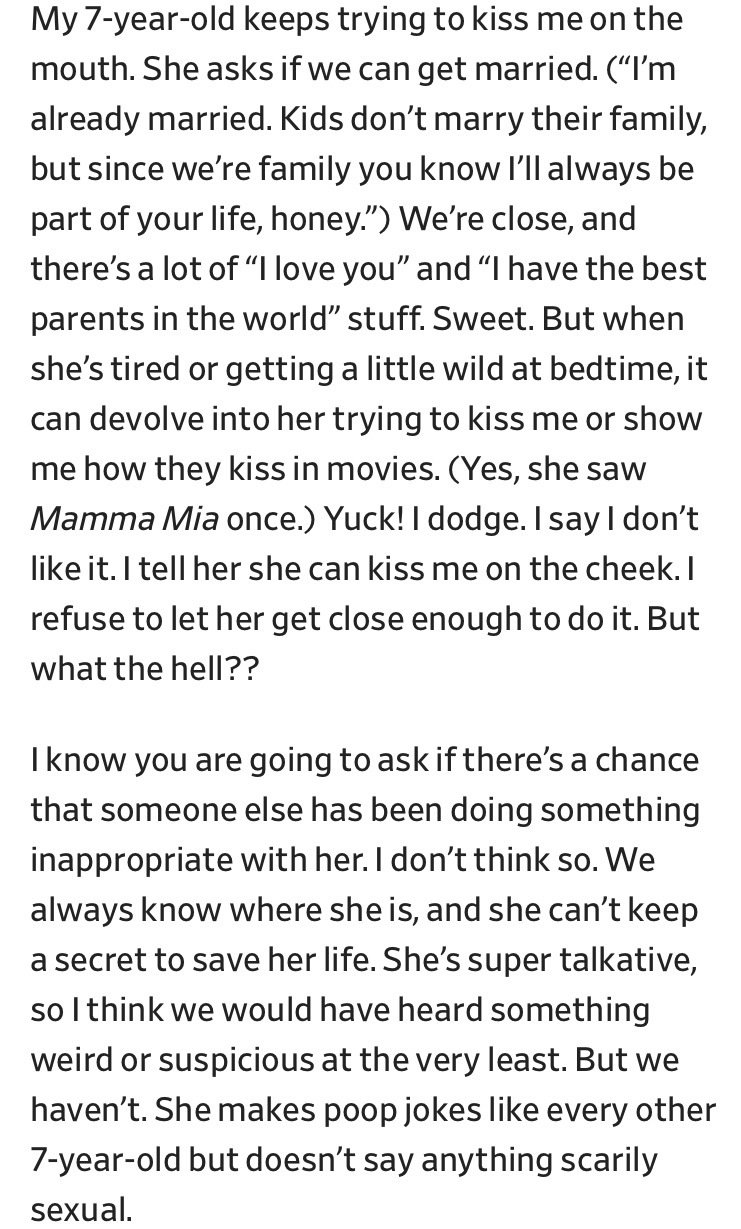 "My 7-year-old keeps trying to kiss me on the mouth," the parent wrote. "She asks if we can get married." And it only gets worse at bedtime.
