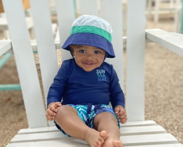 Sand may be hot and there may be rocks even at the shore line. Protect baby's feet with swim shoes. Even if those little feet never touch the ground, the shoes still protect those feet from the sun.