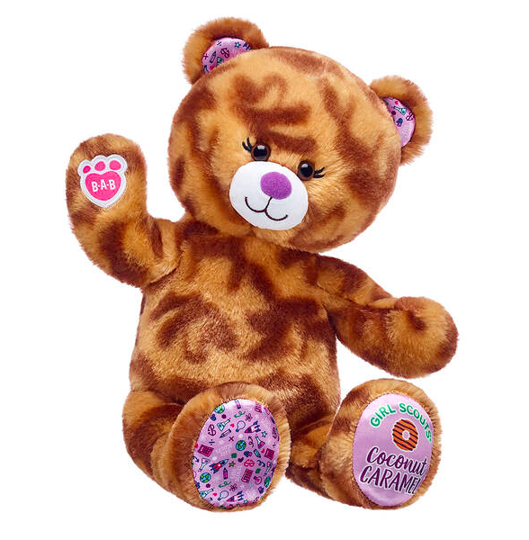 Coconut Caramel Cookie Bear has a swirly coconut caramel coat and a fun doodle print on its ears and one paw. It also comes with a Girl Scout paw pad so you'll always know that you got a bear from this extra special collection.