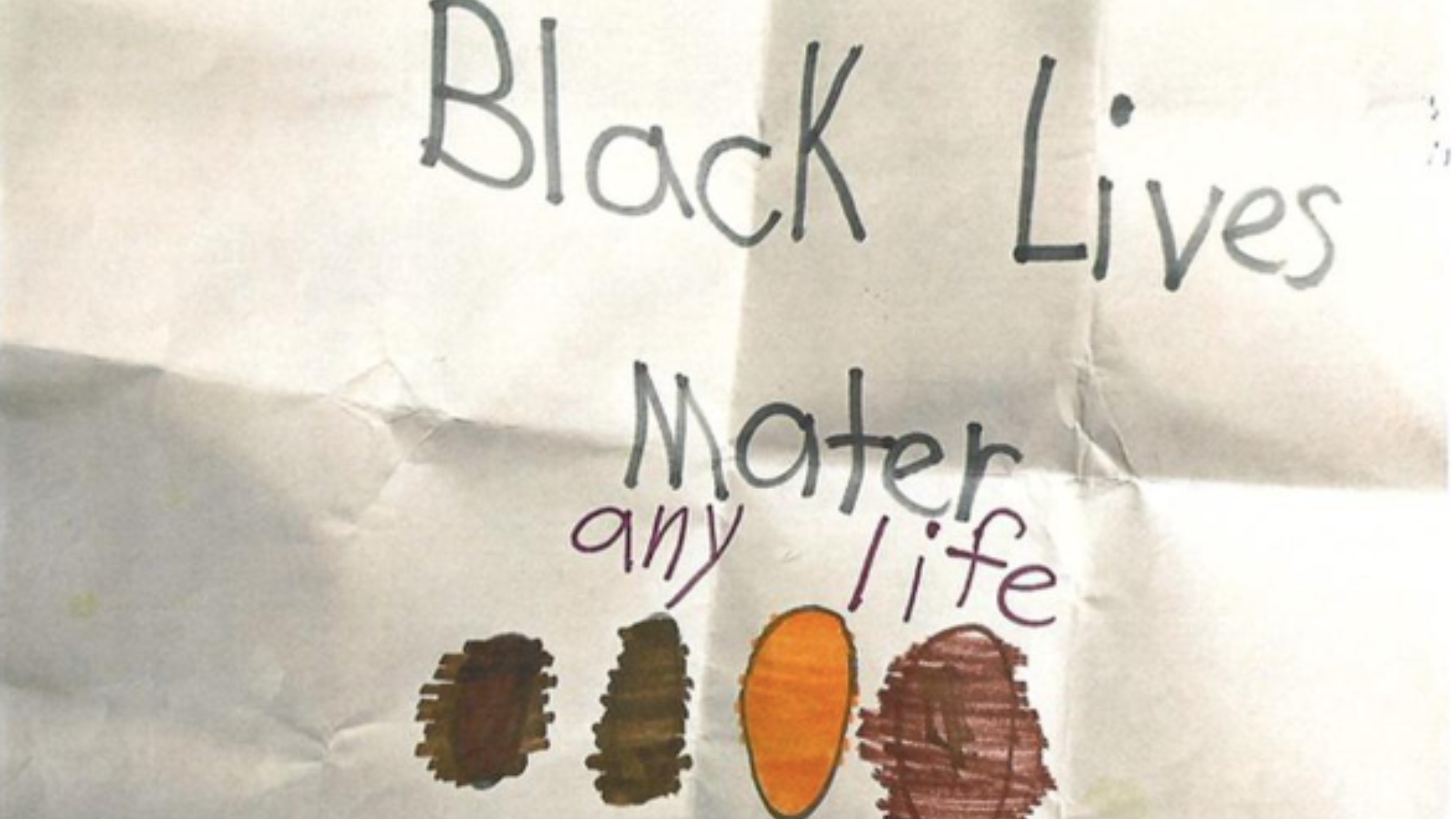 There were round figures with various skin tones: brown, beige, yellow, etc. Above the shapes, B.B. wrote: “Black Lives Mater.” Then, in what may have been an afterthought, she included the phrase, “any life.”