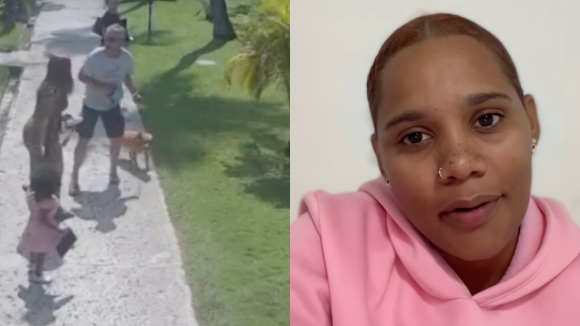 Hanae Peterson, who posts on TikTok as @curls_with_attitude, shared a disturbing surveillance video that shows her walking with her young daughter when a dog on a leash comes running toward her and bites her pant leg. The young mother kicks the dog to protect herself and her child, which seems to anger its owner. What the man does next is shocking. Not only does he yell at Hanae, but he also physically assaults her.