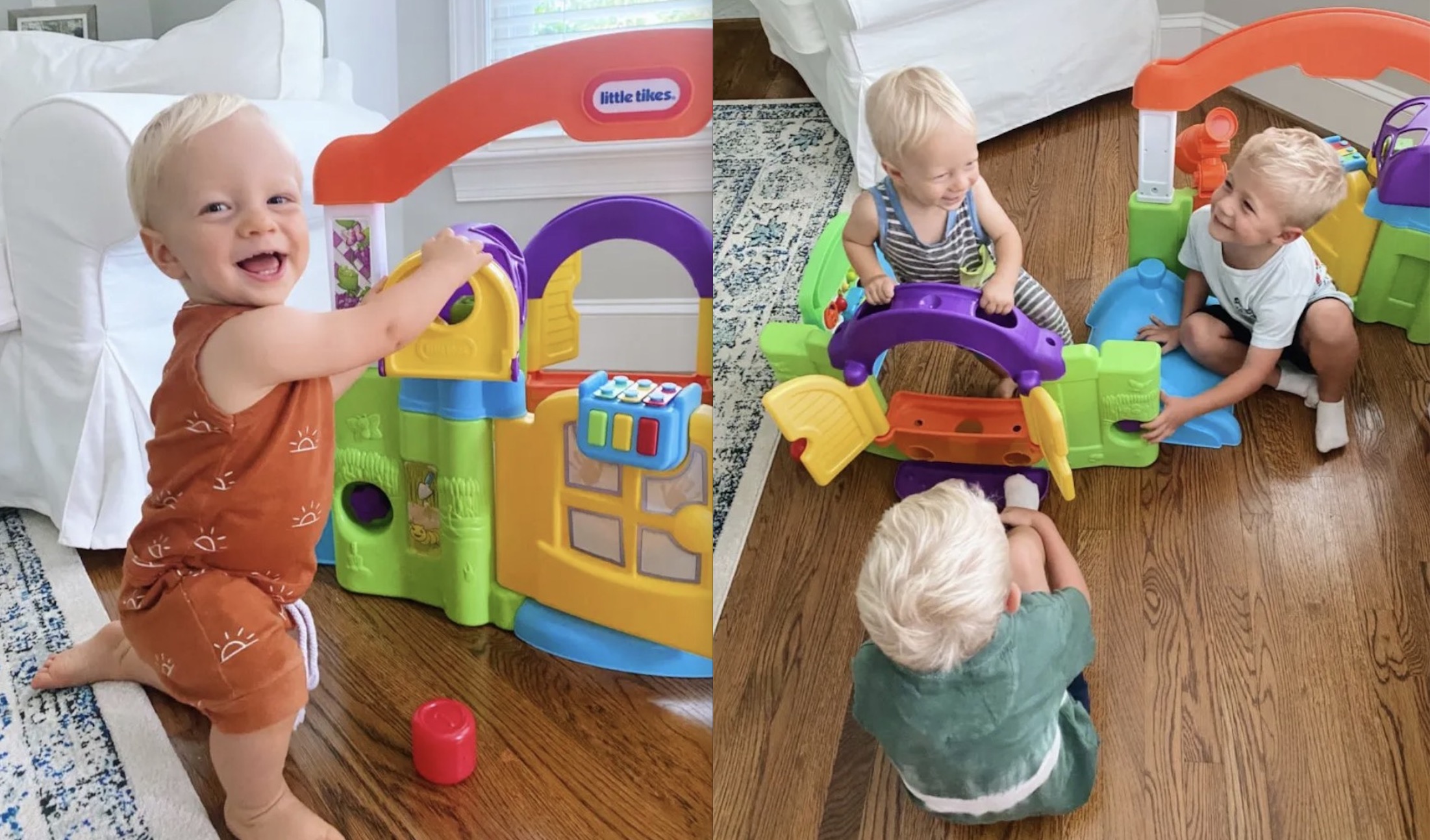 I don’t think Rhett quiiite understands the imagination games his older brothers are playing around him, but he loves this play center and is obsessed with dropping balls down the ball chute and banging on the colorful piano chimes. He crawls his way into it multiple times every day because there are so many different ways for him to play inside the play center and he can’t get enough of the play panel.